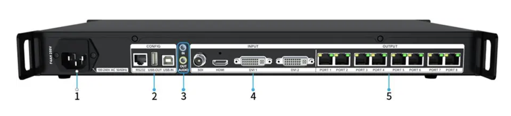 RJ45, 8×1G Ethernet ports output. |